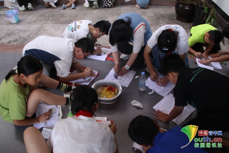 图为实践队员给小朋友分发植物拓染所需要的工具。林馨 供图
