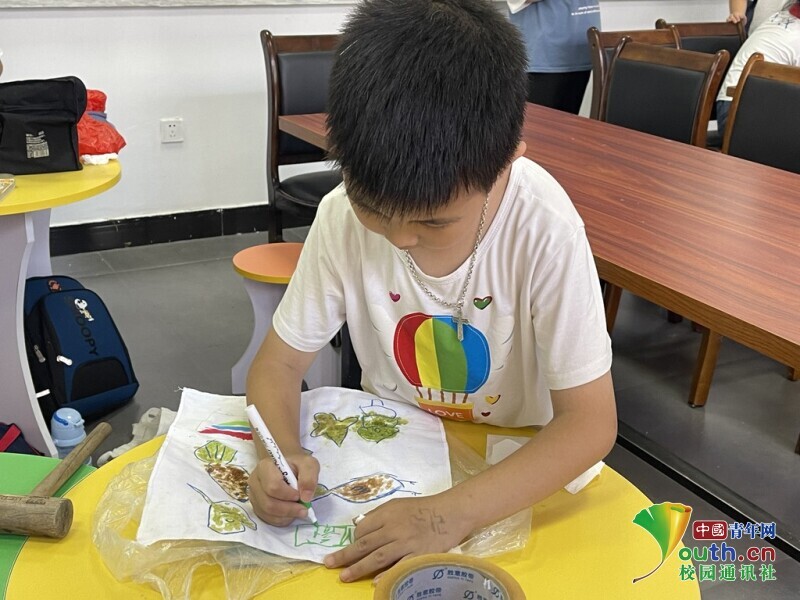 图为小朋友们在认真的敲打自己的拓染作品。 占圣雯 供图