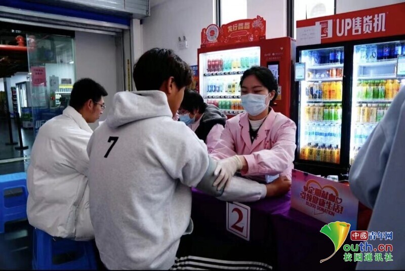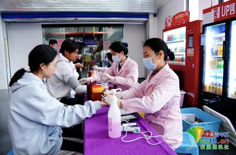 图为医护人员为参与献血的师生进行抽取血样。中国青年网通讯员 许玉立 摄