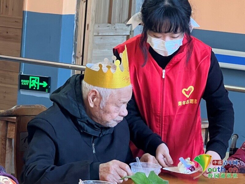图为团队成员在文岭镇敬老院内为老人送上蛋糕。中国青年网通讯员 黄雪 摄