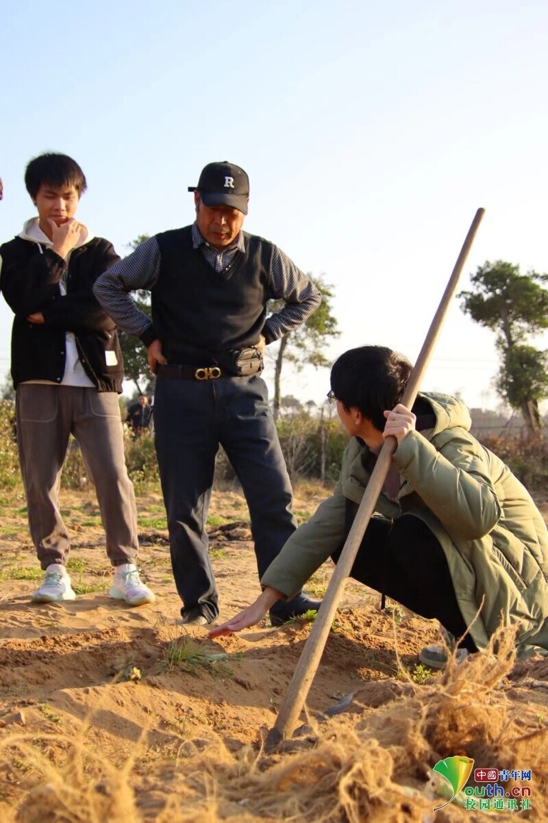 图为学生在农民伯伯的指导下,对土壤进行深翻。中国青年网通讯员 张慧 摄