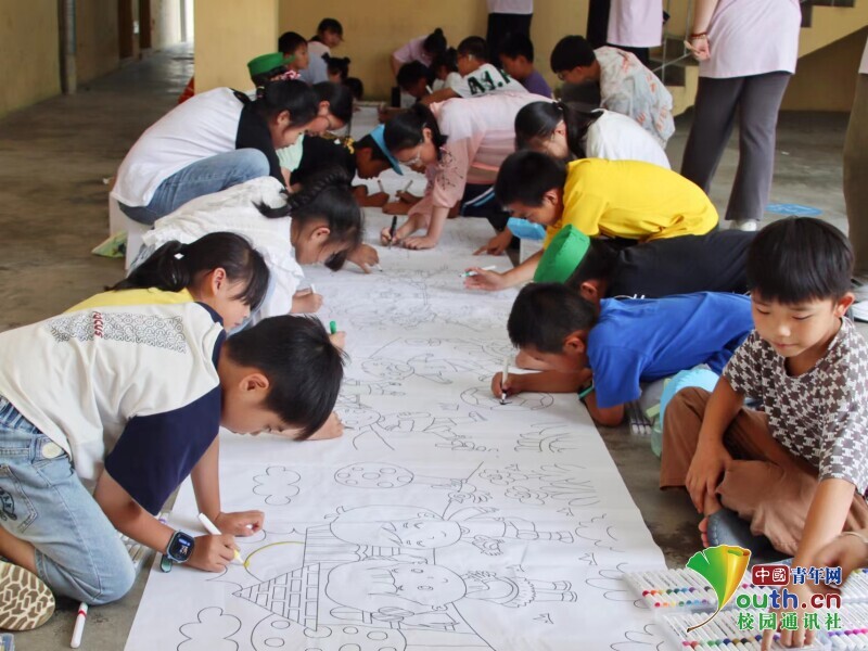 图为小太阳暑期社会实践队队员与小朋友们一同进行“‘画’解情绪,绘出美好”十米画卷活动。中国青年通讯员 侯新新 摄