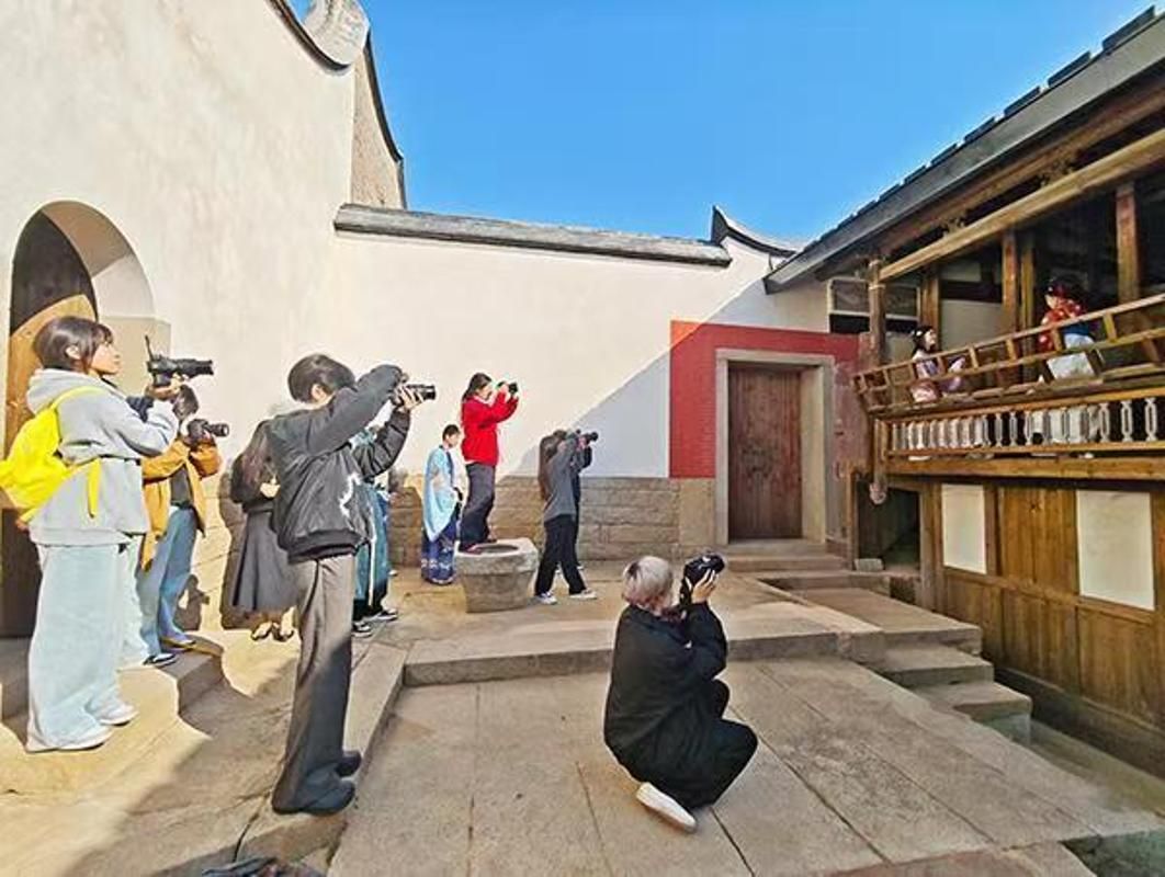 当飘逸的汉服衣袂拂过清代石砌门廊,当专业镜头聚焦于雕梁画栋的斑驳肌理,一场跨越时空的对话在“九头马”古民居悄然上演。近日,福州软件职业技术学院数字影视传媒产业学院师生,走进全国重点文物保护单位——鹤上镇“九头马”古民居,开展专题摄影创作,产出优质影像作品150余幅,为即将举办的“古厝光影”主题摄影展奠定扎实基础。