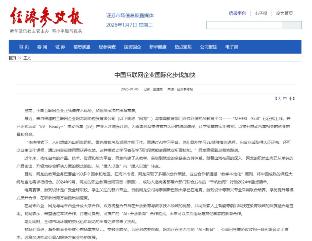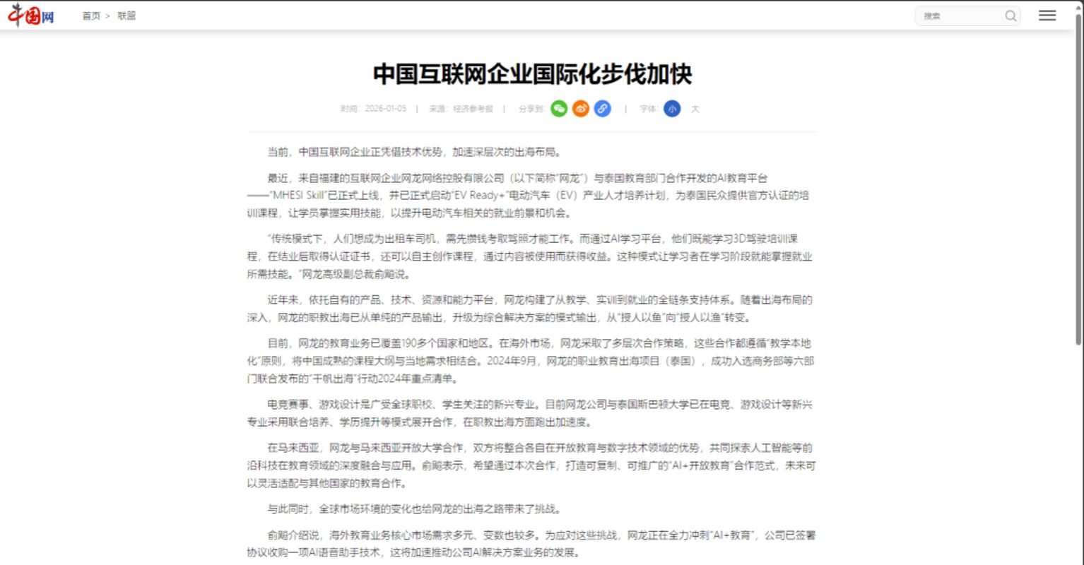 目前,网龙的教育业务已覆盖190多个国家和地区。在海外市场,网龙采取了多层次合作策略,这些合作都遵循“教学本地化”原则,将中国成熟的课程大纲与当地需求相结合。2024年9月,网龙的职业教育出海项目(泰国),成功入选商务部等六部门联合发布的“千帆出海”行动2024年重点清单。