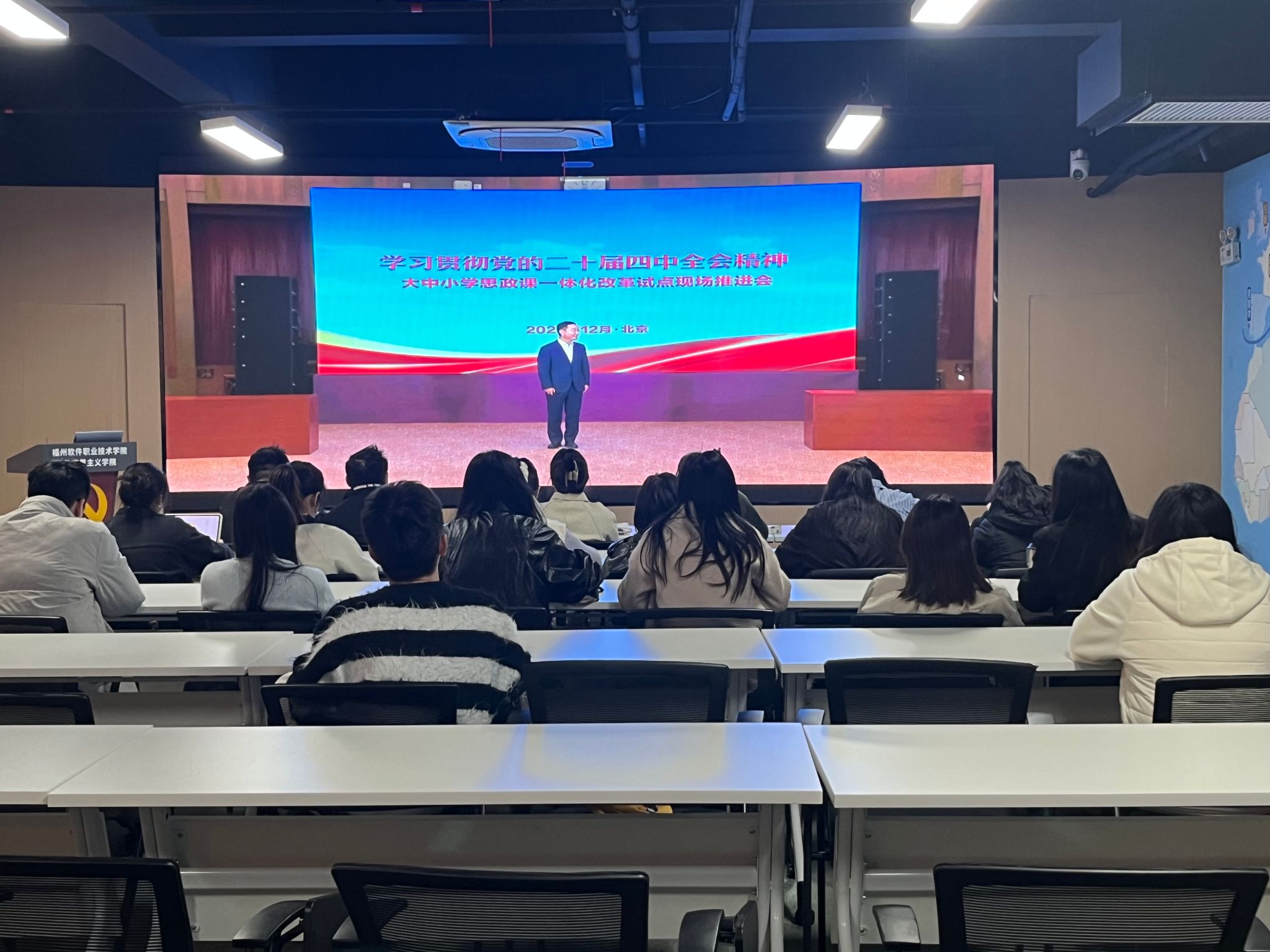 12月5日下午,欧洲杯投注平台_欧洲杯正规平台_欧洲杯体育平台【官方授权】:马克思主义学院组织全体思政课教师集中观摩学习教育部主办的“党的二十届四中全会精神融入大中小学思政课示范说课和微课展示活动”。马克思主义学院副院长叶镇国及各课程教研室教师全程参与。