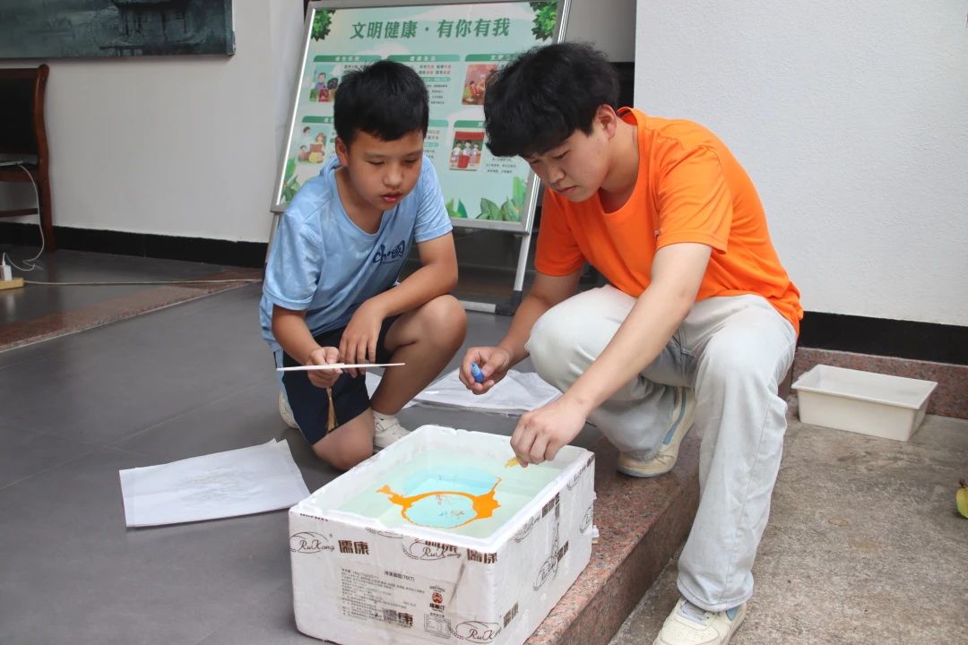 漆扇以扇子为载体,运用大漆工艺制作而成的艺术品,在水面绘出图案效果,晕染在扇子表面,形成自然天成的轮廓。在实践队员的协助下,小朋友们挥洒着童真与想象,将心中的奇思妙想化作一幅幅独特的漆扇。