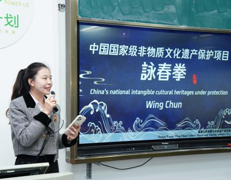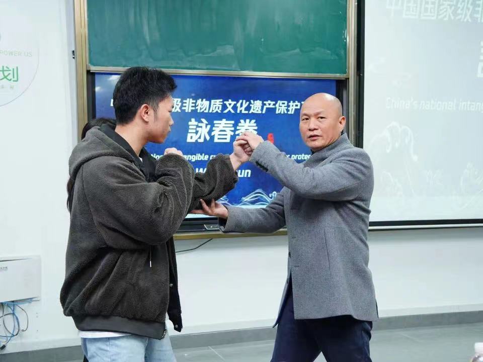 讲座伊始,由校团委副书记黄雪老师进行讲座开场介绍;接着,由国家非遗詠春拳项目保护单位郑涵匀老师介绍主讲老师——王国文老师。