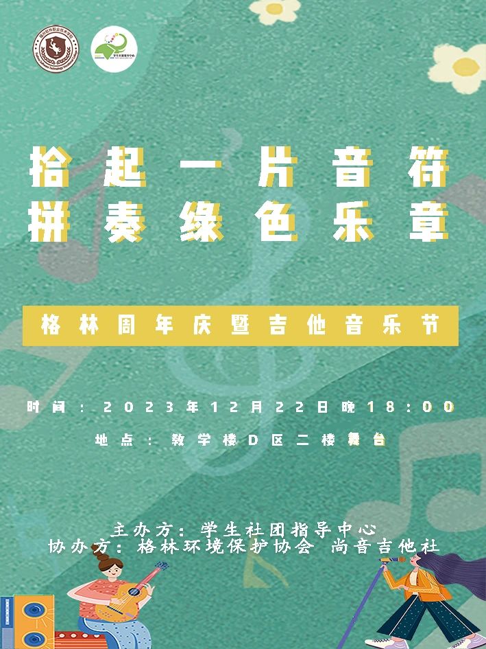 光阴似箭,岁月难留。转眼间,格林环境保护协会已经历经了十七年的时光,也给我们留下了美好回忆。为加强协会成员环保理念建设、弘扬和培育绿色环保精神,激发学生对协会的热爱,我们协同尚音吉他社于12月22日18:00在教学楼D区二楼舞台举办“拾起一片音符,拼奏绿色乐章”——格林周年庆暨吉他音乐节活动。