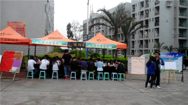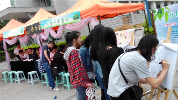 2014523 心理健康教育与咨询中心吴爱梅老师带领心理健康协会骨干在生活区摆摊,为全院师生进行现场心理咨询,让心理服务走进师生生活。活动现场有趣味心理测试、专业心理测试、心语心愿和涂鸦四种形式。此次的心理测试和以往明显不同,现场抛开了过去纸笔测验形式,摆设了6台笔记本电脑,学生可登陆学院瑞格心理测评系统http://xl.fzrjxy.com/psy/login.aspx参与测试,结束后可马上查看结果。吴爱梅老师和心理健康协会骨干利用会谈等多种会谈技术为学生现场解释测试结果,受到很多同学的欢迎。