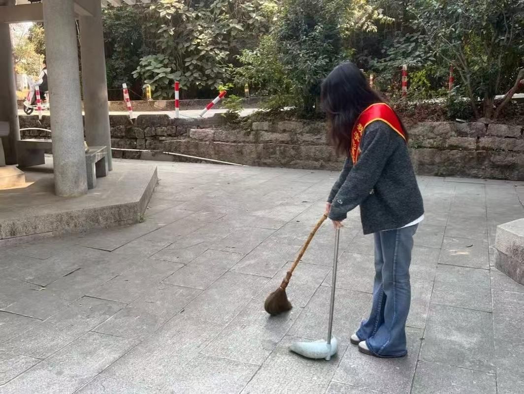 除此之外,刘凌洁同学积极投入将军山公园环境清洁工作,认真清扫亭子周边区域,细致捡拾纸屑、落叶等垃圾。活动结束后,她主动对现场物品进行细心整理,将各类物资规范摆放、分类归位,高效恢复公园整洁面貌。大家以实际行动呵护家乡的绿水青山,共同守护美丽家园。