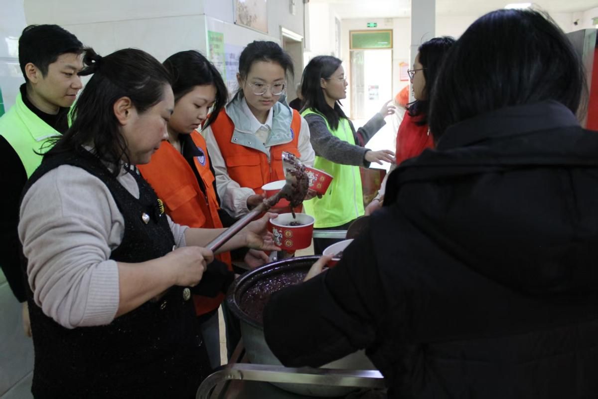 表演落幕,送粥环节暖意融融。志愿者端出精心熬制的拗九粥,糯米软糯搭配花生、红枣、桂圆的香甜,热气中满是美好祈愿。此外,志愿者还送上松软面包与营养燕麦,细心帮行动不便的老人拆包装、嘱慢食。“这粥真甜,心里更甜!”老奶奶紧握志愿者的手,满是感动。