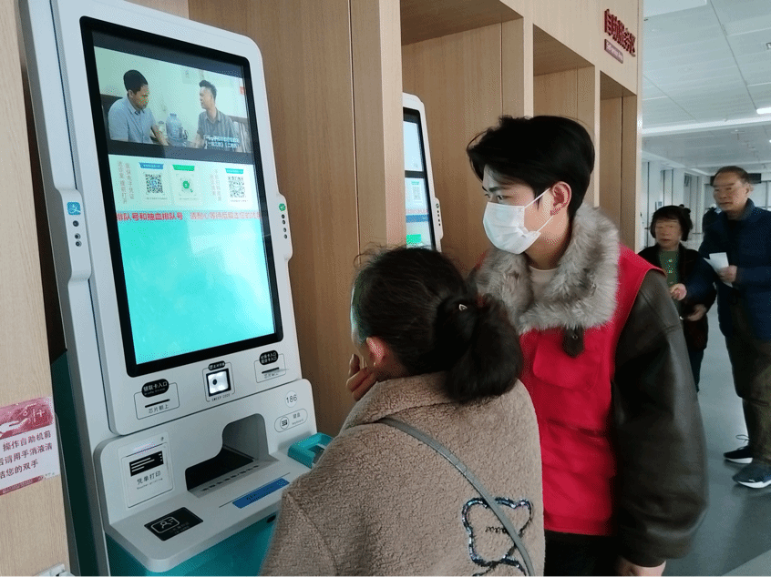 活动初始,入党积极分子积极向医院负责人进行全面系统的岗前学习。大家认真听着负责人介绍着院区布局图,细致拆解医院的整体规划、各功能分区及科室具体位置。随后,在医院门诊大厅与自助服务区里,处处都能看到志愿者们忙碌的身影。大家统一着装、分工明确、默契配合,耐心引导患者有序就诊,细心协助大家完成挂号、缴费、检验报告打印等操作,认真解答每一个疑问。