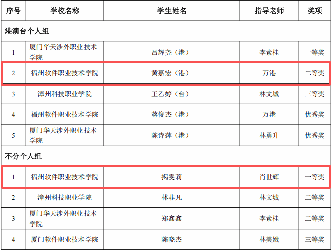 第十二届海峡两岸暨港澳大学生职业技能(能力)大赛是由福建省教育厅、福建省人力资源和社会保障厅、福建省互联网信息办公室、平潭综合实验区管委会联合主办的重要赛事活动。本次大赛旨在促进海峡两岸及港澳地区大学生在职业技能方面的交流与合作,提升学生实践能力和创新精神。经过激烈的角逐,比赛结果已于2026年1月6日于“海峡两岸暨港澳大学生职业技能(能力)大赛”官方网站正式公布。获奖名单公示链接:http://www.hxlajnds.cn/sai/noticeInterface.jsp?id=46
