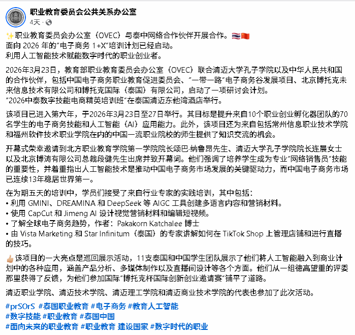 泰国教育部职业教育委员会官方 Facebook 账号对2026年中泰合作 “电子商务1+X”培训项目进行了集中报道。
