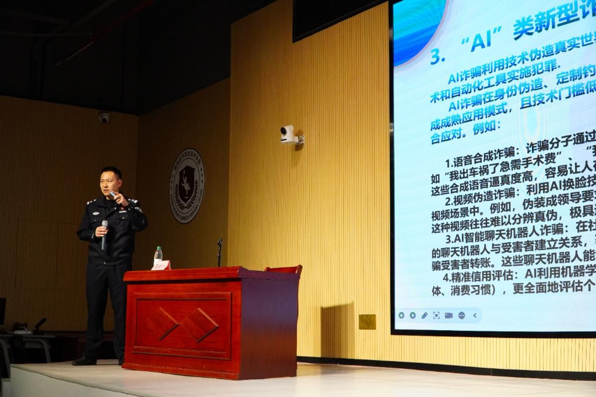 讲座伊始,主讲人蒋桂文警官先明确了电信网络诈骗的定义——不法分子以非法占有为目的,通过远程、非接触式手段编造虚假信息实施诈骗,并介绍了2022年12月1日正式施行的《中华人民共和国反电信网络诈骗法》,以及2025年至今长乐区四百多起电信诈骗案发情况,让师生直观感受到反诈的紧迫性。随后,蒋桂文警官围绕刷单返利、网络交友、网络购物、投资理财、校园贷款、游戏交易、机票退改签7类校园高发骗局展开详细拆解,结合2024年长乐区大学生刷单被骗1.7万元、虚假投资被骗11万余元、网络购物被骗7500元等真实案例,还原了“前期引流——小利诱惑——大额诈骗”的套路流程,还重点讲解了AI合成音视频、智能聊天机器人等新型诈骗的识别方法,期间穿插播放《刷单被骗 现身说法》《以案说诈》等警示视频,强化宣讲效果。