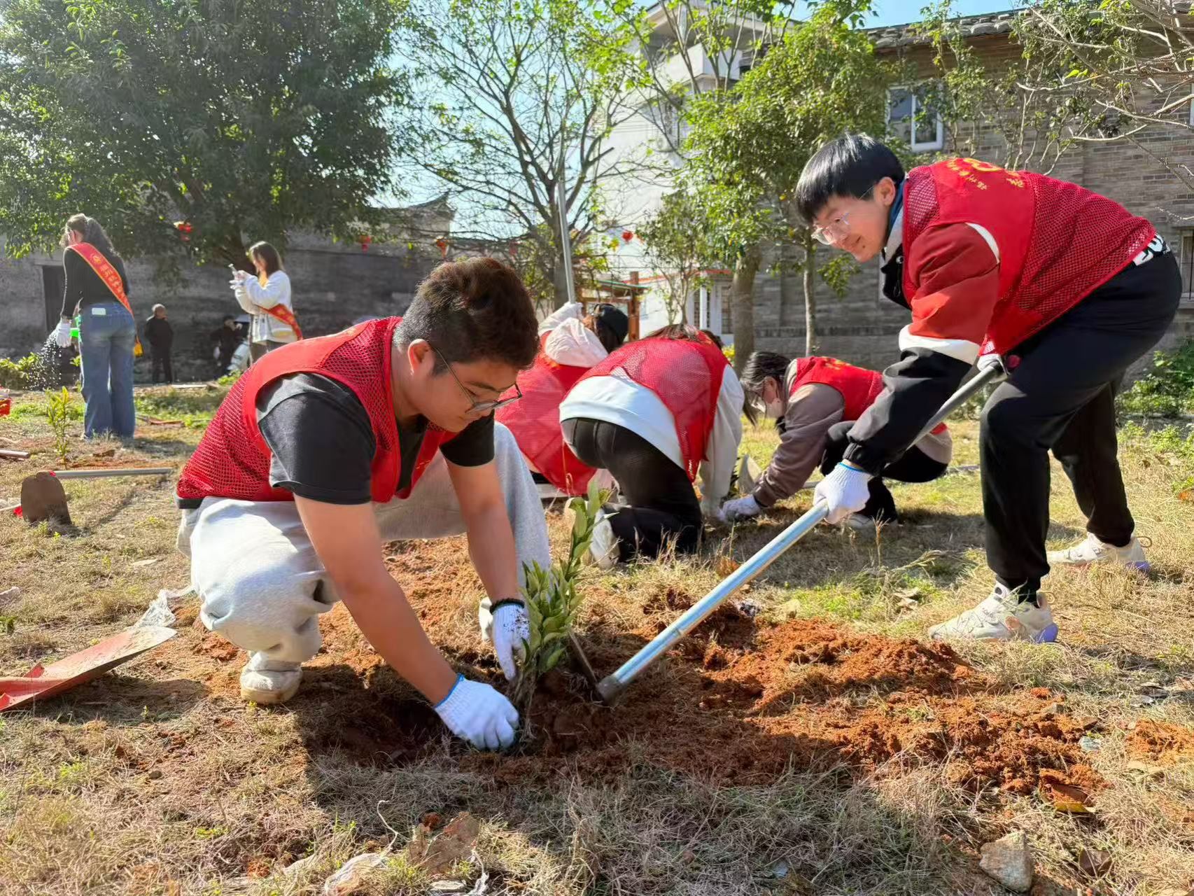 活动伊始,在负责人员的统筹安排下,同学们有序领取铁锹、水桶、树苗等物资,以小组为单位分工协作,奔赴指定种植区域。大家挽袖躬身、挥锹挖坑,小心翼翼地扶苗、填坑、踩实、培土,有条不紊地提水浇灌,每一个步骤都细致认真,用双手为大宏华侨广场种下片片新绿,让雷锋精神在植绿护绿的实践中落地生根。